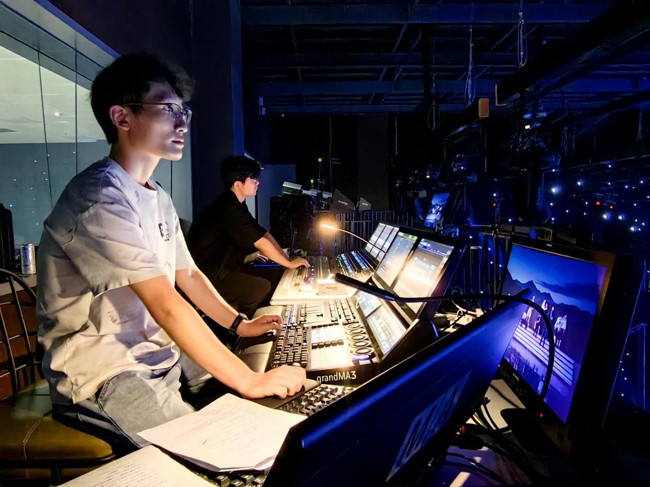 600平米演播廳配備先進(jìn)的燈光、音響設(shè)備為演出提供了技術(shù)保障,寧波廣電技術(shù)團(tuán)隊(duì)與浙江工商職院導(dǎo)演團(tuán)隊(duì)反復(fù)溝通、調(diào)試,定制燈光方案,確保整體環(huán)節(jié)、燈光、音響與劇情完美融合。