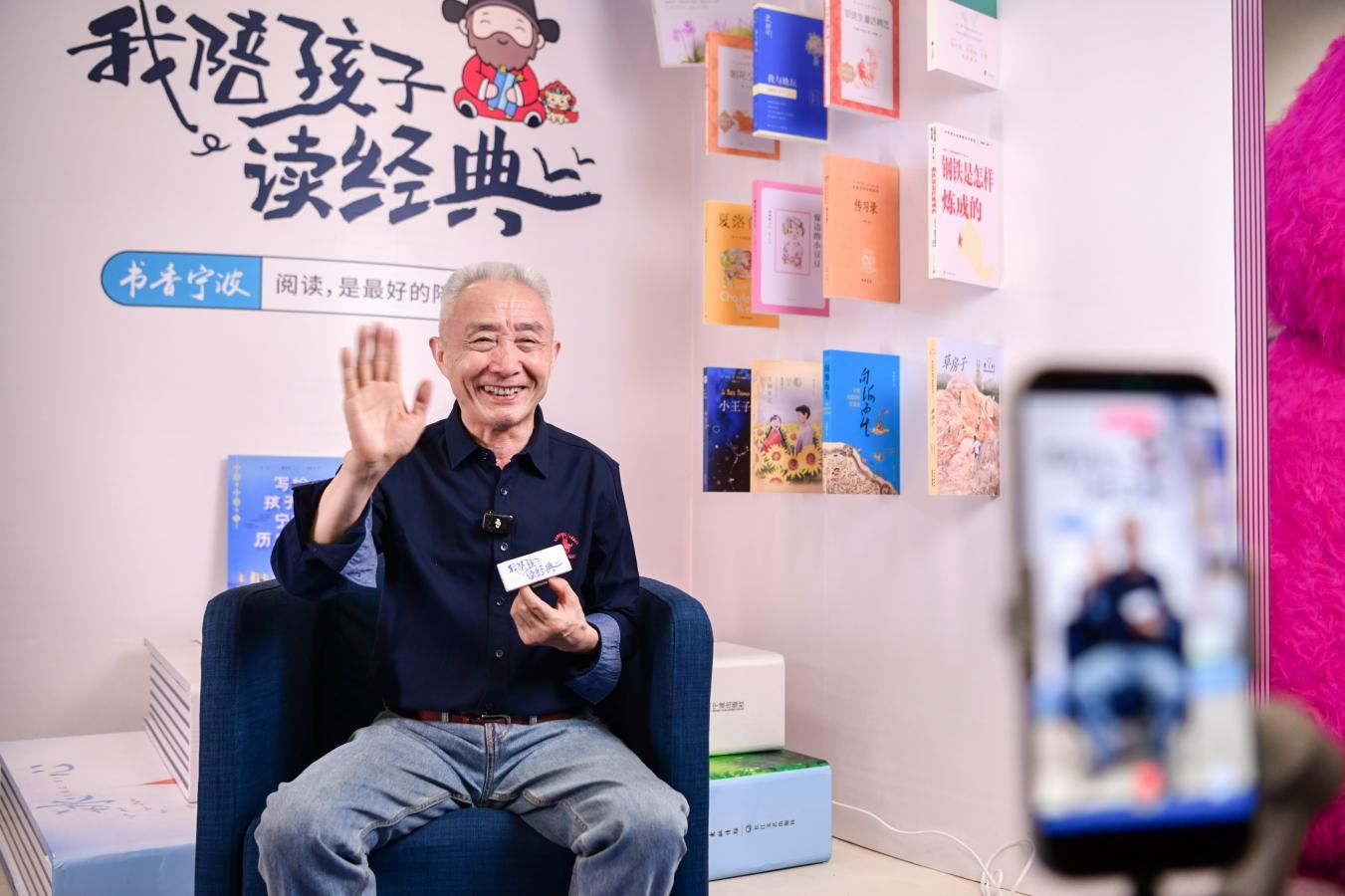 作家戴建業(yè)在“我陪孩子讀經(jīng)典”少兒館采訪區(qū)接受采訪