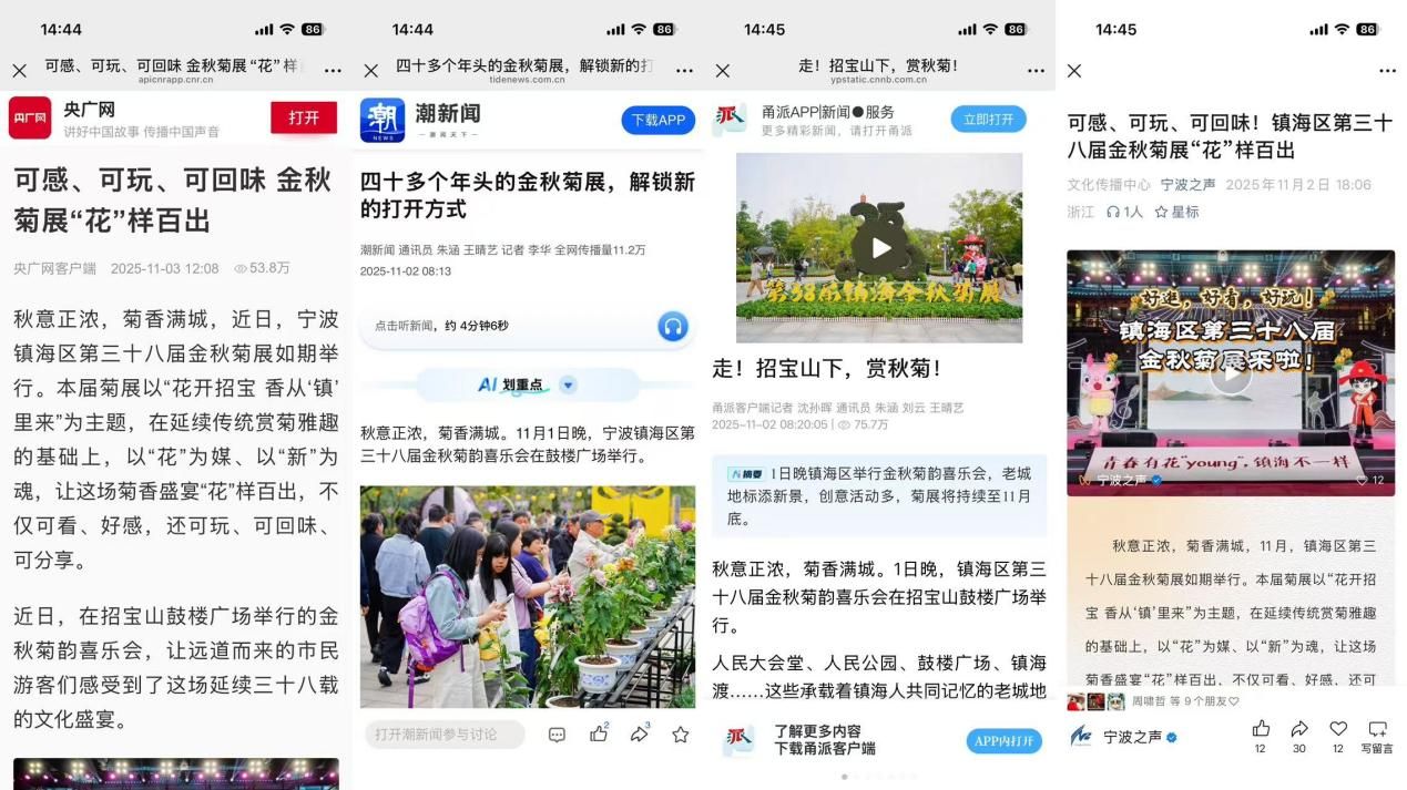 活動(dòng)受到了各級(jí)媒體的廣泛關(guān)注,依托央廣網(wǎng)、潮新聞、寧波文旅等中央、省、市級(jí)重點(diǎn)媒體平臺(tái),形成梯次化、持續(xù)性的宣傳矩陣。隨著菊展為期一個(gè)月的深入舉辦,相關(guān)報(bào)道與內(nèi)容持續(xù)推發(fā),推動(dòng)活動(dòng)熱度穩(wěn)步攀升。截至菊展中期,累計(jì)全網(wǎng)曝光量突破500萬(wàn),顯示出活動(dòng)廣泛的社會(huì)關(guān)注度和持續(xù)增強(qiáng)的品牌影響力。