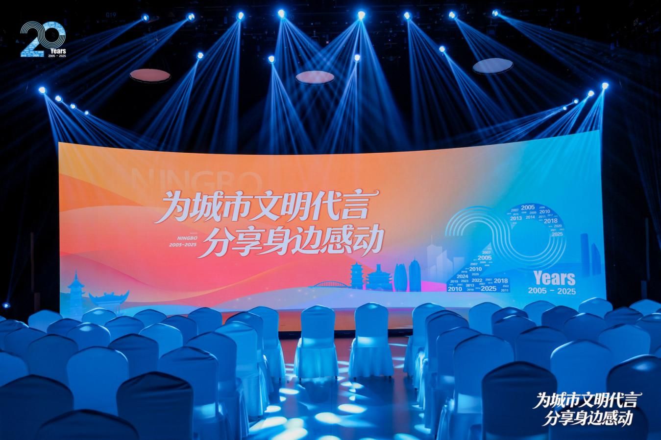 作為本次活動(dòng)承辦方,面對(duì)20年的時(shí)間跨度和龐大信息量,如何精準(zhǔn)破題、高效執(zhí)行,成為電視傳媒執(zhí)行團(tuán)隊(duì)面臨最大的挑戰(zhàn)。整場(chǎng)活動(dòng)以“為城市文明代言”為主題框架,從“身邊·感動(dòng)”切題。從20年史料中精準(zhǔn)提煉重大事件、城市變遷與典型人物,巧妙構(gòu)建敘事邏輯。以“宏大敘事”開場(chǎng),層層遞進(jìn)并轉(zhuǎn)承至“感動(dòng)就在身邊”的溫情脈絡(luò),將歷史的厚重感成功落地為老百姓的人間煙火,為寧波城市文明創(chuàng)建20周年呈上一份精彩的答卷。