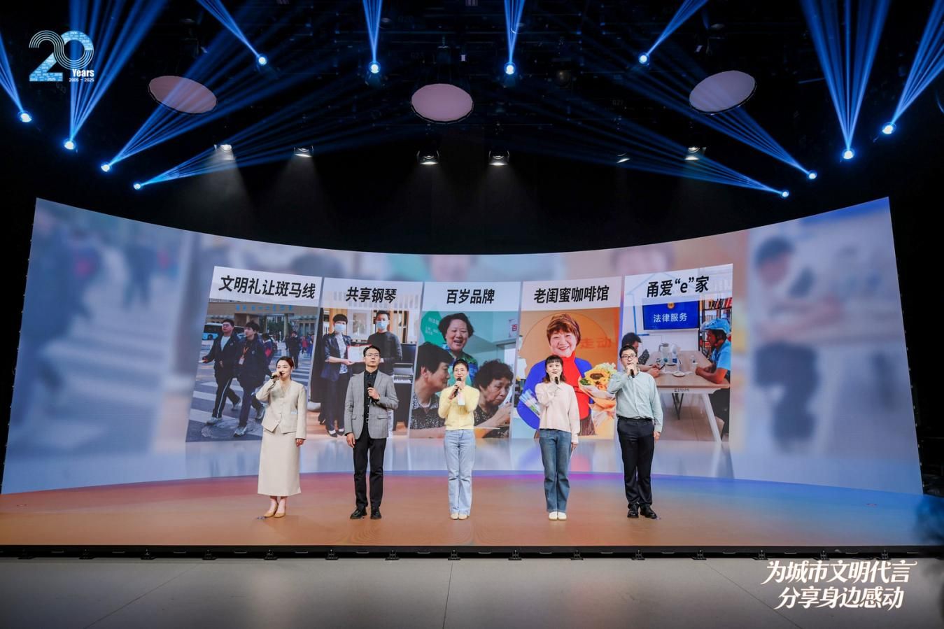 活動(dòng)以《二十年·與文明同行》的視頻VCR開篇,分別闡述“家園蝶變·美在身邊”“身邊感動(dòng)·愛有回響”“瞬間永恒·善意流淌”“城市符號(hào)·群體之光”“文明向未來·與愛同行”五個(gè)篇章,以及尾聲“文明寧波·有你有我”一起獻(xiàn)禮寧波,告白寧波。