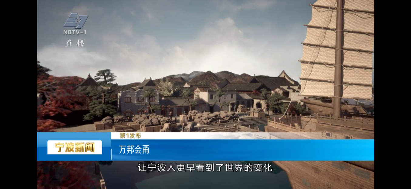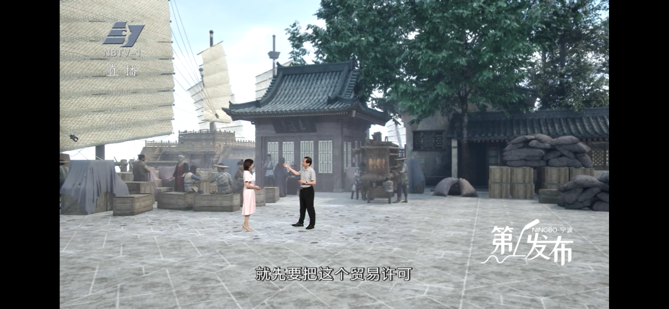 XR打造的虛擬場景加持是這一系列的一大亮點,實現多媒介融合,“時空雙線敘事”?。?每期節(jié)目前半部分在海洋文化地標取景,結合季節(jié)變化,增強視覺美感;“下半場”?XR場景的加入,?在實景基礎上疊加虛擬元素,如建筑遺跡,形成了“現實與歷史”的對話。其中第四期“潮起三江千帆競”中,XR技術復原了兩宋時期寧波港的重要組成部分——來安門。隨著發(fā)布人講述,這道“門”也動了起來,徐徐打開。當時的寧波港碼頭在屏幕里重生,主持人和發(fā)布人一同體驗海上貿易流程,從貨物裝卸到海關驗貨,沉浸式感受古代港口的商業(yè)活力。這期節(jié)目獲發(fā)布人肯定,XR場景使歷史敘事更具說服力。
