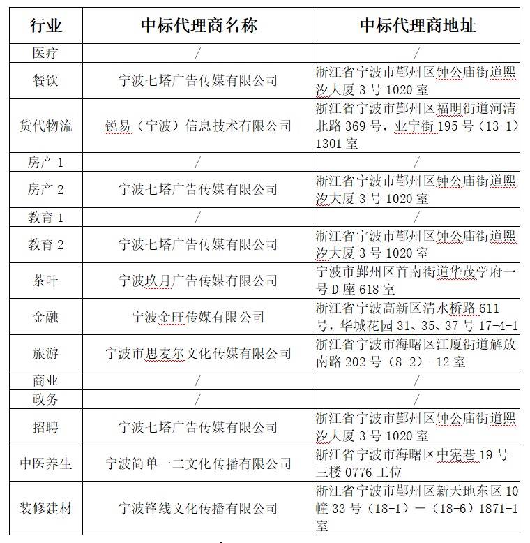 因發(fā)展需要,現(xiàn)向社會(huì)招募(招標(biāo))2026行業(yè)廣告代理。招募行業(yè)包括醫(yī)療、餐飲、貨代物流、房產(chǎn)(房產(chǎn)1和房產(chǎn)2)、教育(教育1和教育2)、茶葉、金融、旅游、商業(yè)、政務(wù)、招聘、中醫(yī)養(yǎng)生、裝修建材等十三個(gè)行業(yè)。