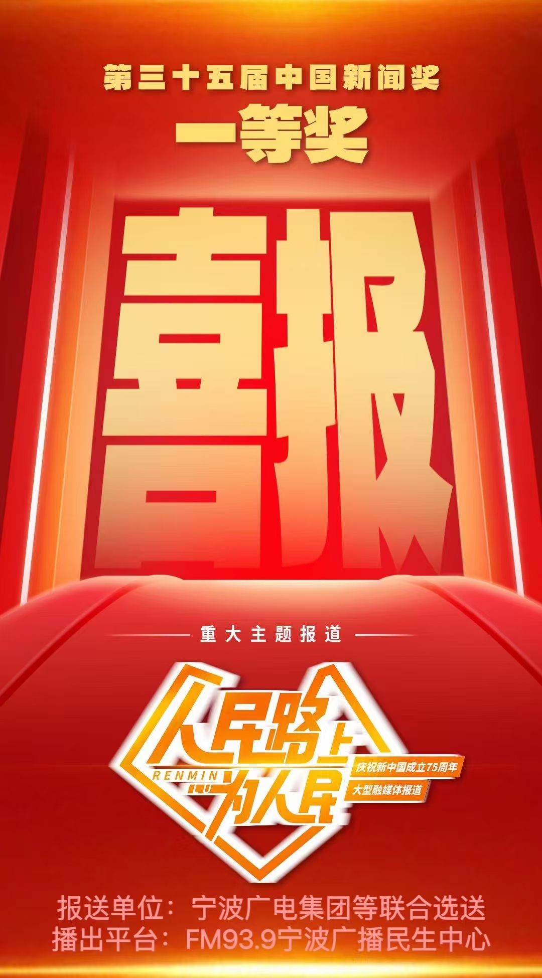 11月5日,第35屆中國新聞獎評選結果揭曉,來自全國各級各類媒體的377件作品獲中國新聞獎,其中特別獎4件、一等獎74件、二等獎113件、三等獎186件。其中,寧波廣電集團參與創(chuàng)作的重大主題報道《人民路上為人民》榮獲中國新聞獎一等獎。
